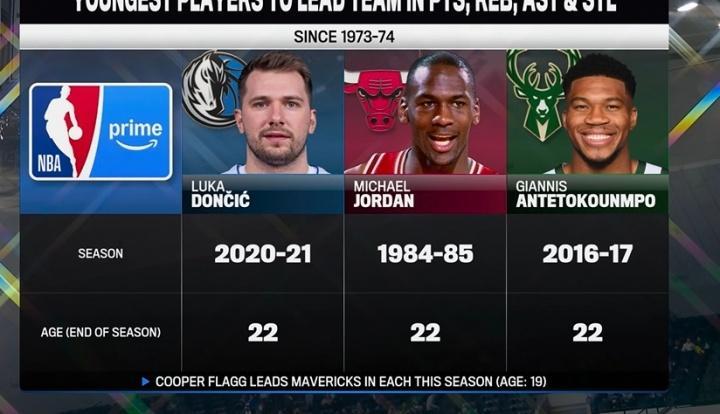 需要关注的是,历史上最年轻的得分、篮板、助攻、抢断均领衔全队的球员,分别有20-21赛季,22岁的东契奇;84-85赛季,22岁的迈克尔乔丹,16-17赛季,22岁的字母哥。本赛季弗拉格得分篮板助攻抢断也领衔全队,而弗拉格仅仅只有19岁。